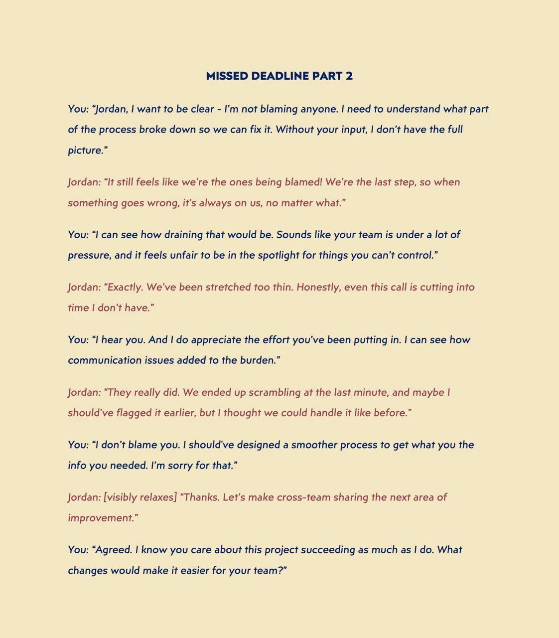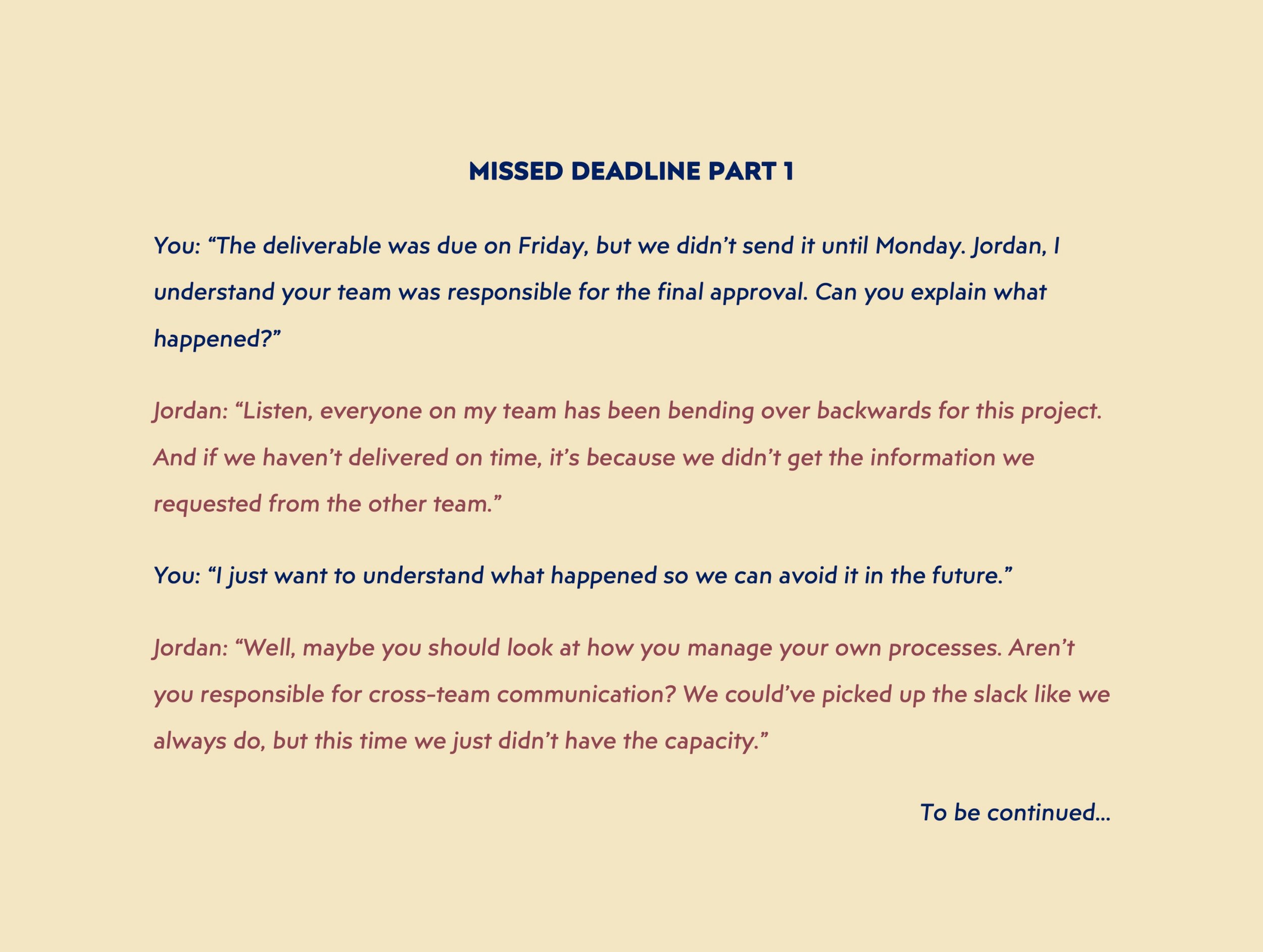 Imagine you’re a project manager and the development team just missed a big deadline that affected the entire pipeline. You’re jumping on a call with Jordan, the team lead, to find out what happened: