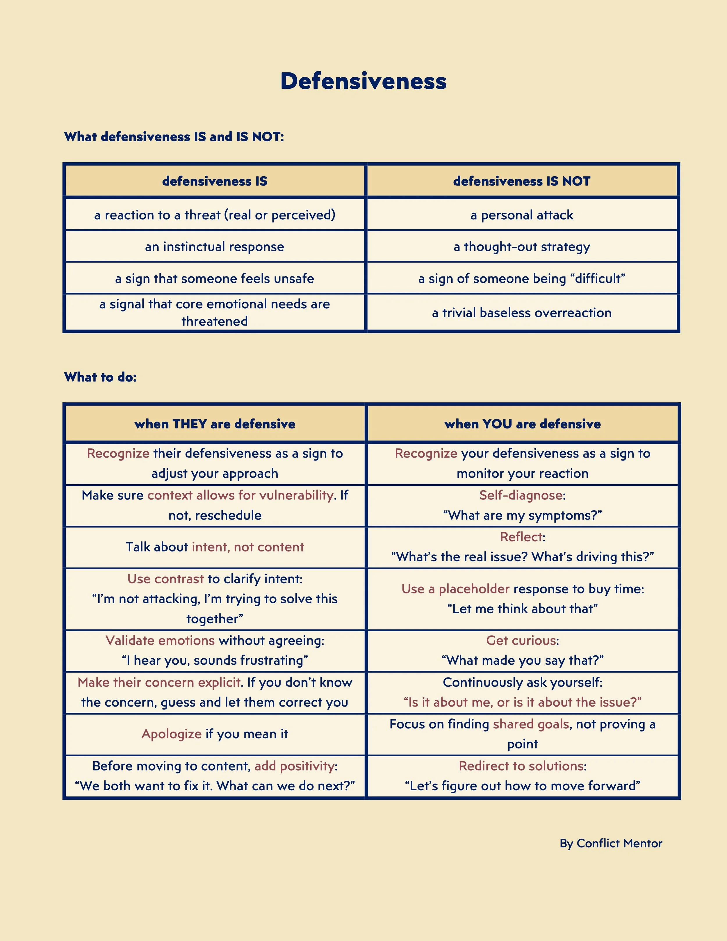 Staking your success in conflict on never getting defensive is an exercise in futility. You will slip up, it’s pretty much guaranteed - we’re only human. What matters is how you prepare for it and the amount of effort you’re willing to invest. Like any skill, the more you practice, the more natural it becomes, until it feels almost effortless.